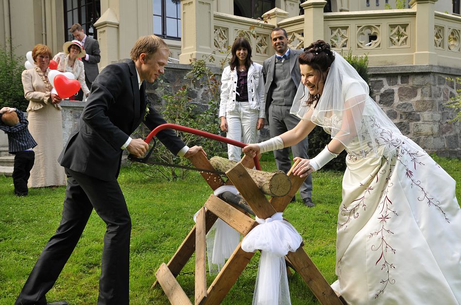 Ralf und Ani, gar nicht träge, sägen heimlich mit der Säge, ritzeratze! voller Tücke, in den Baumstamm eine Lücke.